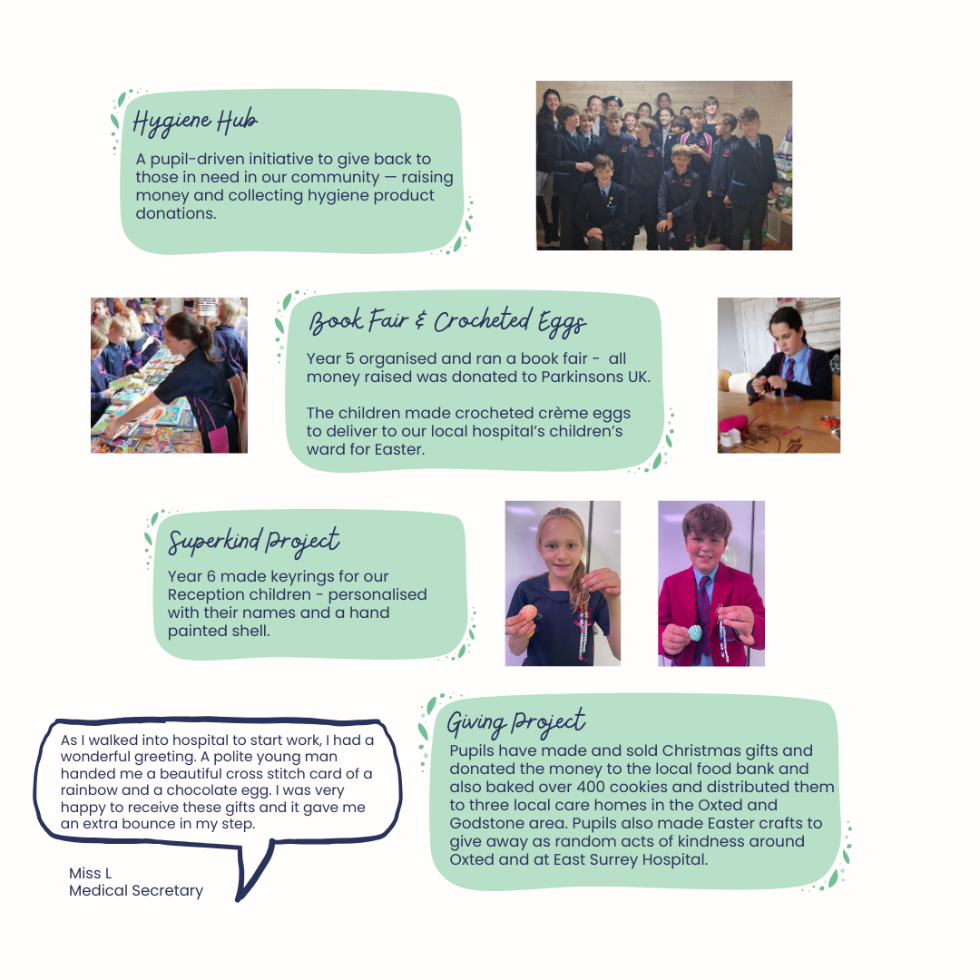 At the end of 2023, Year 5 launched a new initiative called The Giving Project. So far, pupils have made and sold Christmas gifts and donated the money to the local food bank and also baked over 400 cookies and distributed them to three local care homes in the Oxted and Godstone area. More recently, pupils made Easter crafts to give away as random acts of kindness around Oxted and at East Surrey Hospital.